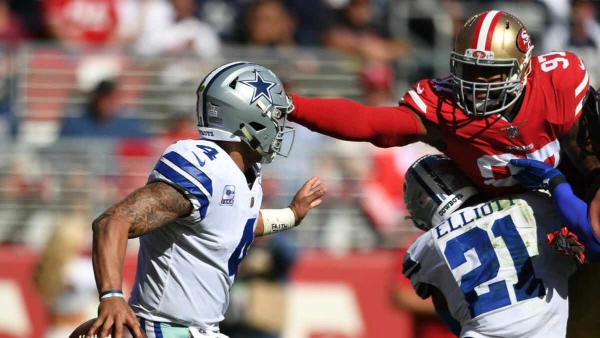 Dak Prescott and Ezekiel Elliott led the charge as the Cowboys demolished the 49ers, 40-10, in Santa Clara. Prescott threw for three touchdowns and ran for one while Elliot piled up 147 yards and two scores on the ground. Elliott also caught a 72-yard touchdown pass as Dallas cruised to the victory. Dez Bryant and Jason Witten caught touchdowns as the Cowboys ended a two-game slide. Rookie C.J. Beathard made his first start at quarterback for San Francisco, and was sacked five times and lost a pair of fumbles. He rushed for the Niners' only touchdown as they dropped to 0-and-7.