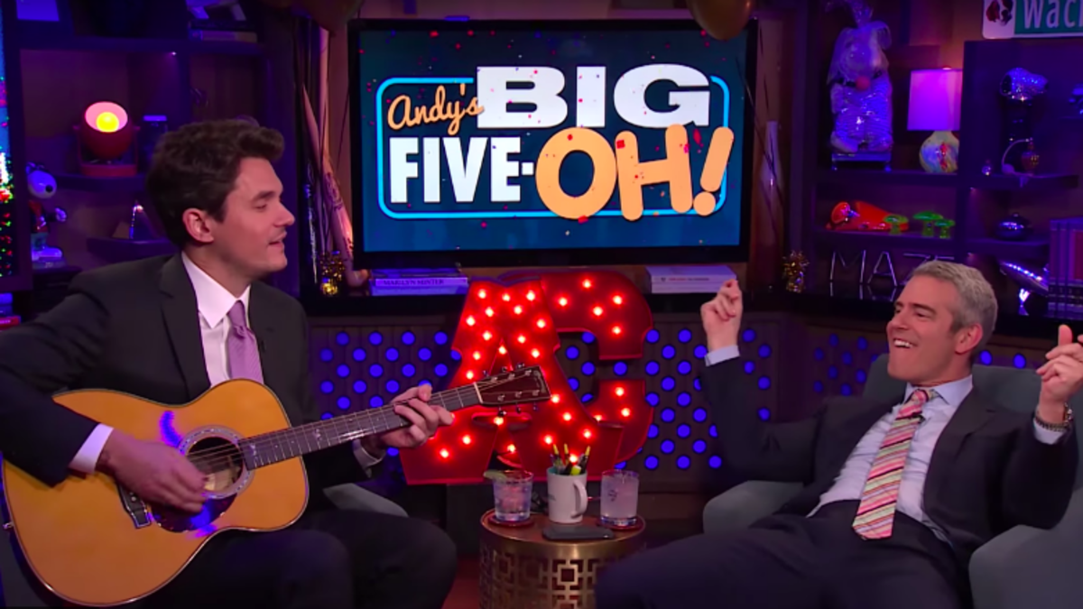 Andy Cohen and John Mayer are close friends, as evident by the pop singer/songwriter's recent serenade to the late-night host on Watch What Happens for his 50th birthday. While the acoustic performance ended with Mayer planting a kiss on Cohen, the two aren't dating, contrary to the Internet whispers.