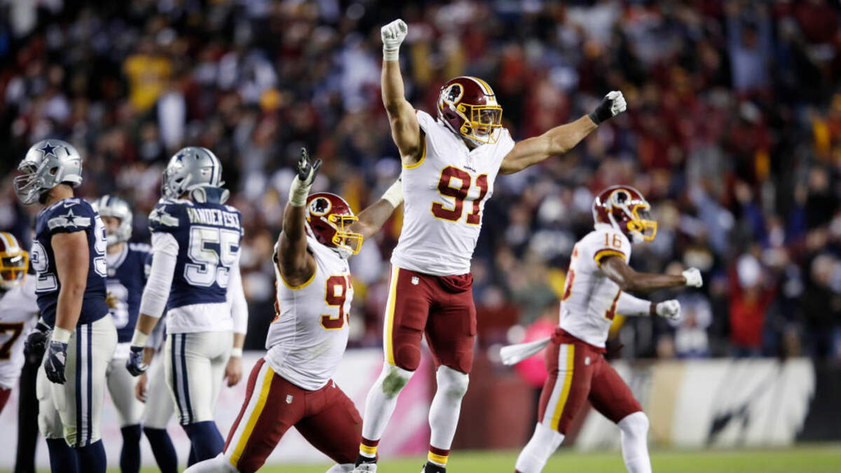 A strip-sack and defensive touchdown ruined the Cowboys' comeback attempt in a 20-17 loss to the Redskins at FedEx Field. The Redskins led by three with five minutes to play when Ryan Kerrigan strip-sacked Dak Prescott near the goal line and Preston Smith recovered the ball for a score. Alex Smith threw a touchdown pass and Adrian Peterson fell one yard short of 100. The Redskins are first in the NFC East at 4-and-2. Prescott threw for a score and ran for another in the loss. Ezekiel Elliott was limited to 33 yards on 15 carries. Michael Gallup caught three passes for 81 yards and a touchdown as Dallas fell to 3-and-4 and 0-and-4 on the road. Brent Maher missed a field goal as time expired that would have sent the game to overtime.