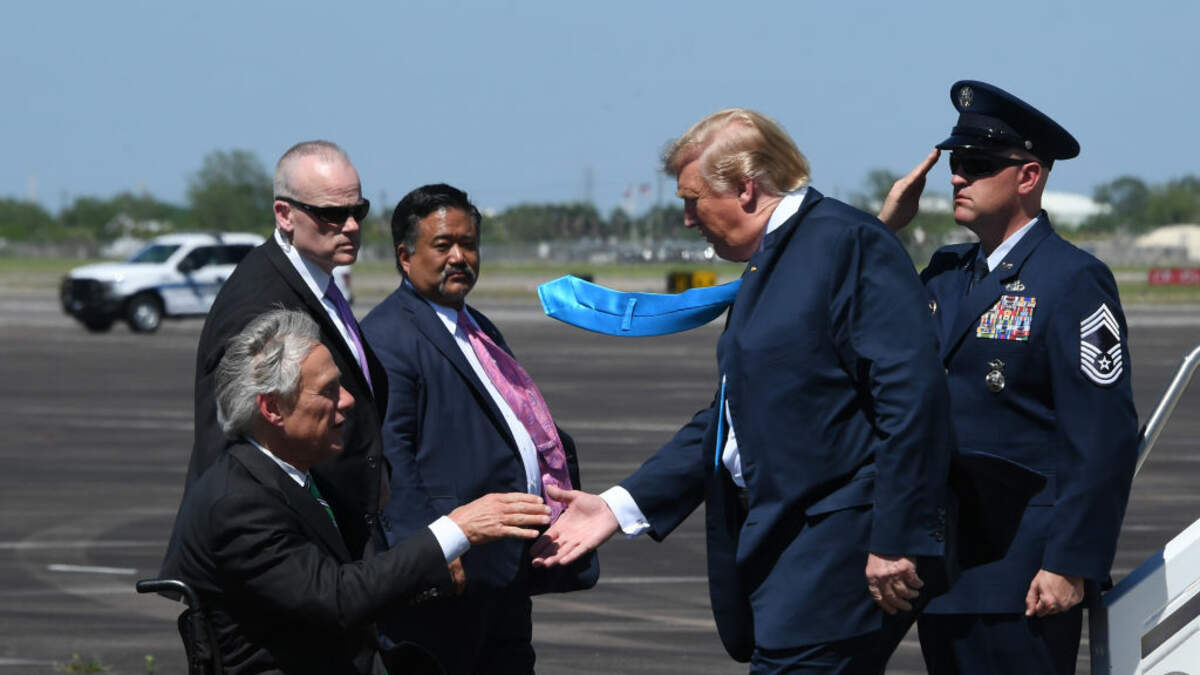 Photo: President Donald Trump shake hands with Texas Governor Greg Abbott as he steps off Air Force One upon arrival at Ellington Field Joint Reserve Base in Houston. (Getty Images)