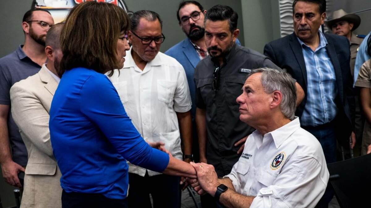 Photo: Texas Representative Evelina "Lina" Ortega (L) shakes the hands of Texas Governor Greg Abbott after a press briefing, following a mass fatal shooting, at the El Paso Regional Communications Center in El Paso. (Getty Images)