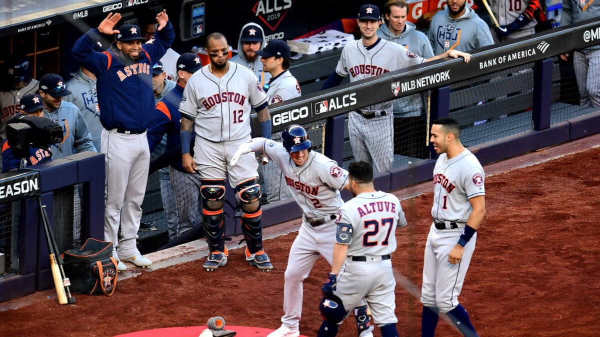 Photo: Jose Altuve #27 of the Houston Astros celebrates with Carlos Correa #1 and Alex Bregman #2 after hitting a home run in the first inning of their game against the New York Yankees during game three of the American League Championship Series at Yankee Stadium on October 15, 2019 in the Bronx borough of New York City. (Getty Images)