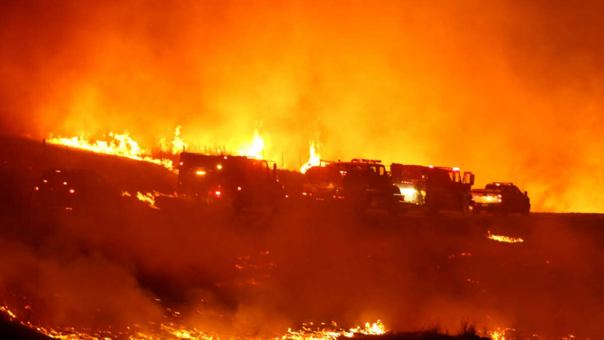 Photo: Fire trucks drive through an area where the Kincade Fire is burning in Geyserville, California. (Getty Images)