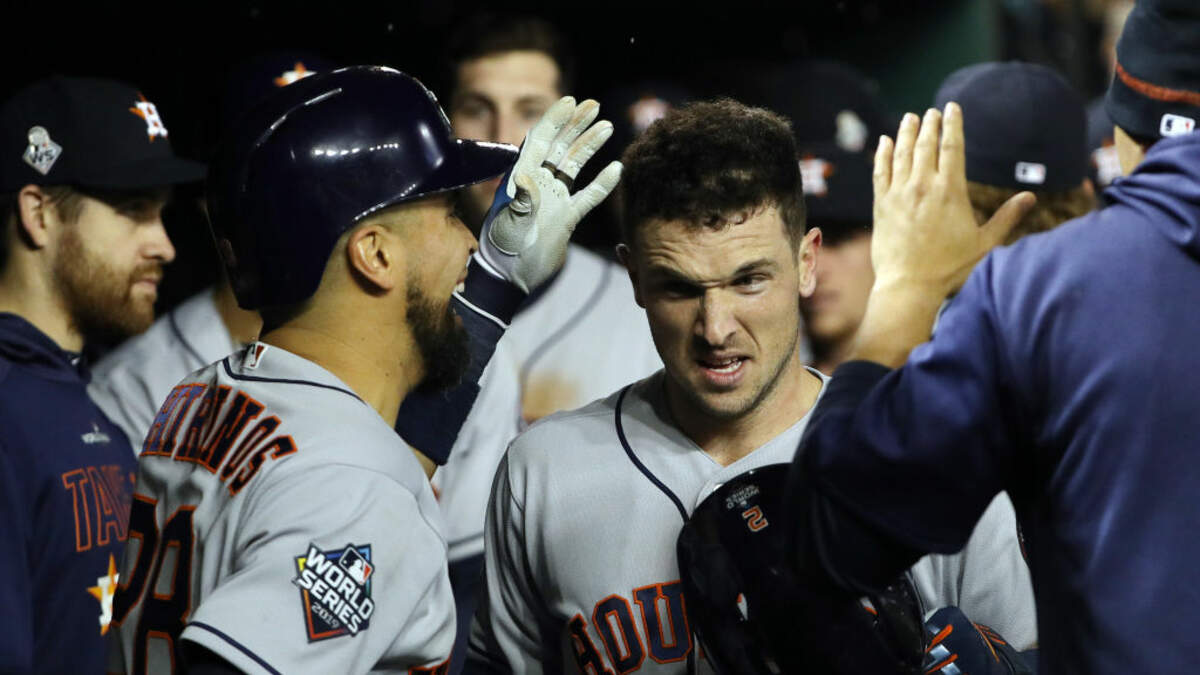 Photo: Alex Bregman #2 of the Houston Astros is congratulated by his teammates after hitting a grand slam home run against the Washington Nationals during the seventh inning in Game Four of the 2019 World Series at Nationals Park on October 26, 2019 in Washington, DC. (Getty Images)
