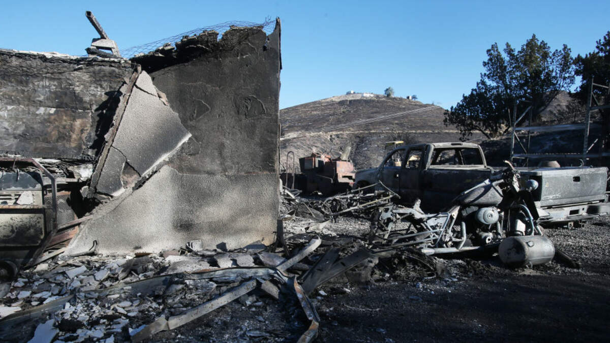 Photo: A structure and vehicle stand scorched by the Tick Fire on October 25, 2019 in Canyon Country, California. The fire has blackened 4,300 acres thus far with around 40,000 people under mandatory evacuation orders. (Getty Images)