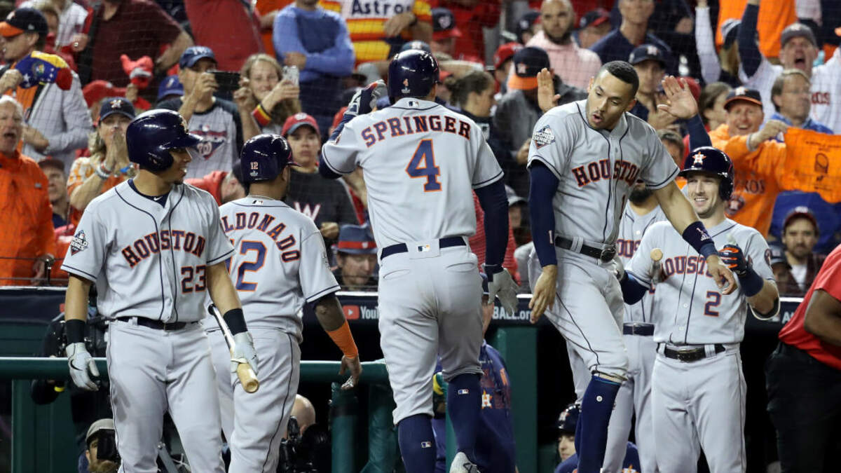 Photo: George Springer #4 of the Houston Astros is congratulated by his teammates after hitting a two-run home run against the Washington Nationals during the ninth inning in Game Five of the 2019 World Series at Nationals Park on October 27, 2019 in Washington, DC. (Getty Images)