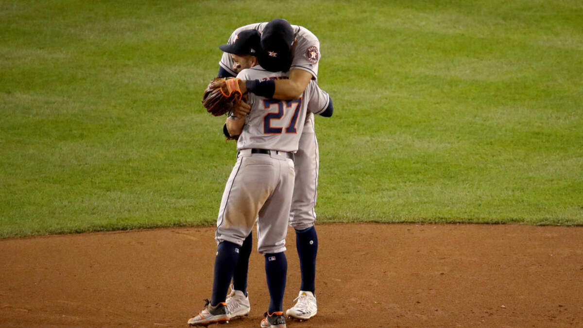 Photo: Houston Astros Shortstop #1 Carlos Correa and Second Baseman #27 Jose Altuve embrace following their 7-1 win over the Washington Nationals in Game Five of the 2019 World Series on October 27, 2019 in Washington, DC. (Getty Images)