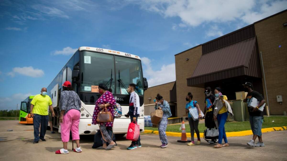 Photo: People board buses at the Port Arthur Civic Center to evacuate the city ahead of Hurricane Laura. (Getty Images)