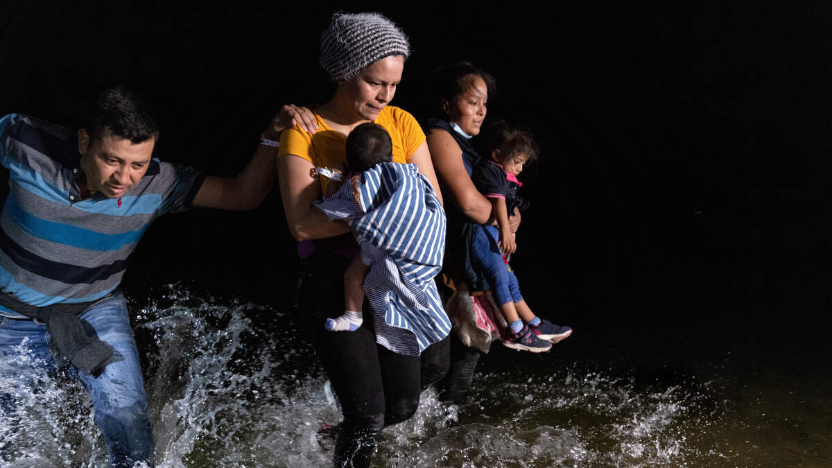 Photo: A family from El Salvador walks ashore to the bank of the Rio Grande at the U.S.-Mexico border on April 14, 2021 in Roma, Texas. A smuggler had rafted them over from Mexico with other immigrants. (Getty Images)