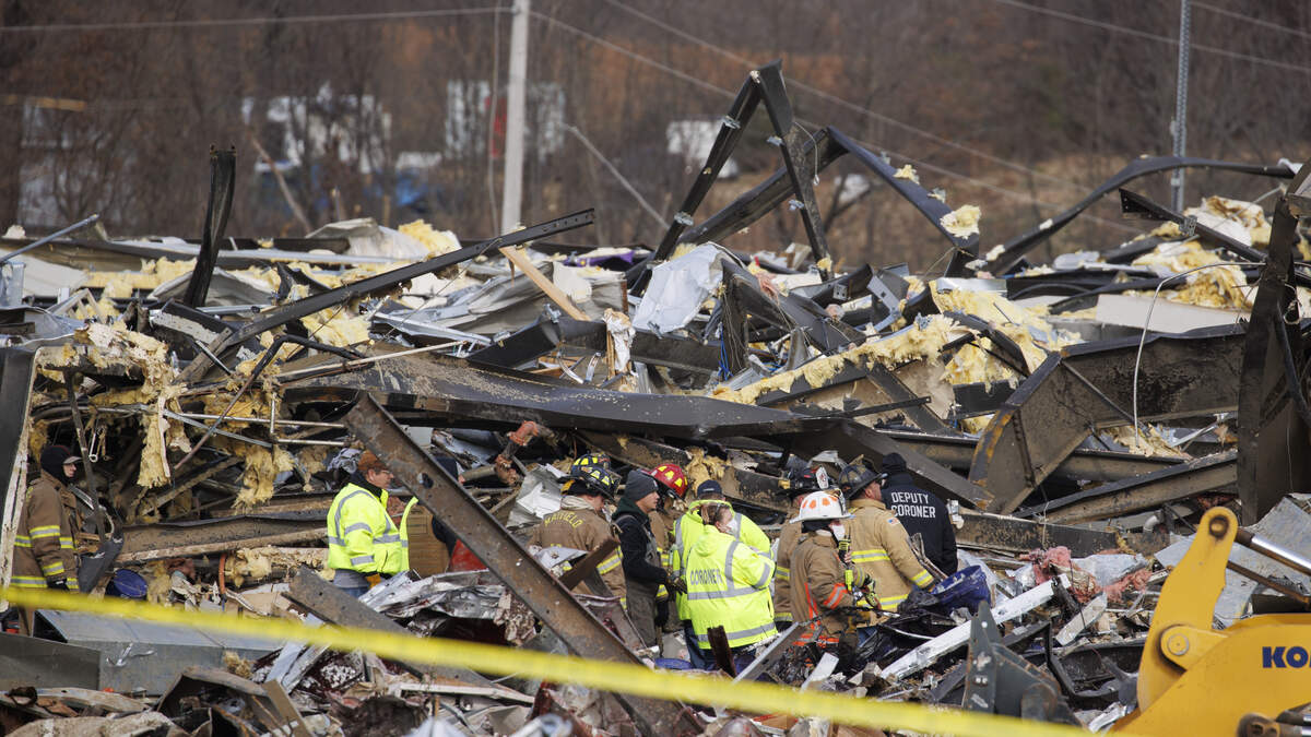 Emergency crews including members of the coroners office search through the flattened Mayfield Consumer Products building in Mayfield, Kentucky. Photo: Getty Images