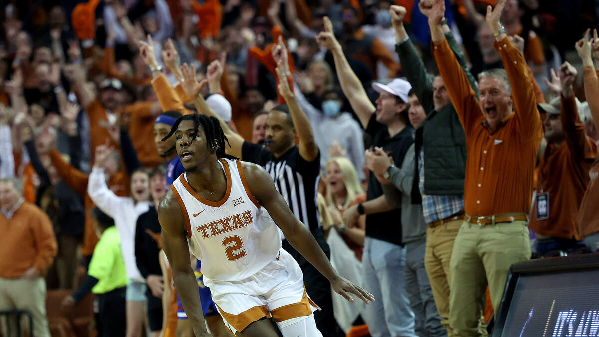 Marcus Carr #2 of the Texas Longhorns reacts as the Texas Longhorns defeat the Kansas Jayhawks 79-76.Photo: Getty Images