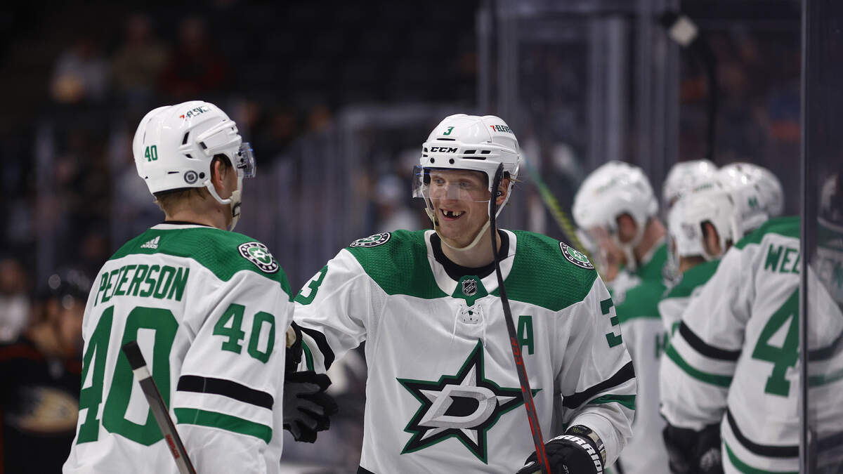 ANAHEIM, CALIFORNIA - MARCH 29: Jacob Peterson #40 and John Klingberg #3 of the Dallas Stars celebrate a goal against the Anaheim Ducks in the third period at Honda Center on March 29, 2022 in Anaheim, California. (Photo by Ronald Martinez/Getty Images)Photo: Getty Images