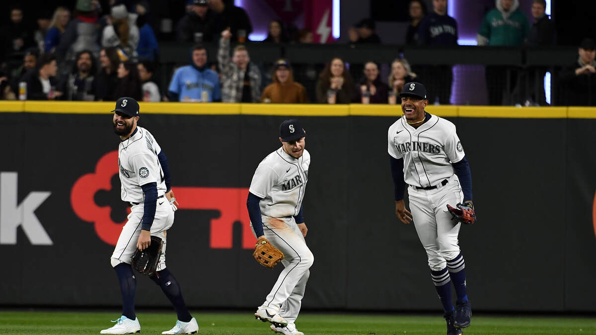 Jesse Winker #27, Jarred Kelenic #10, and Julio Rodriguez #44 of the Seattle Mariners celebrate after the game against the Texas Rangers at T-Mobile Park on April 20, 2022 in Seattle, Washington. (Photo by Alika Jenner/Getty Images)Photo: Getty Images