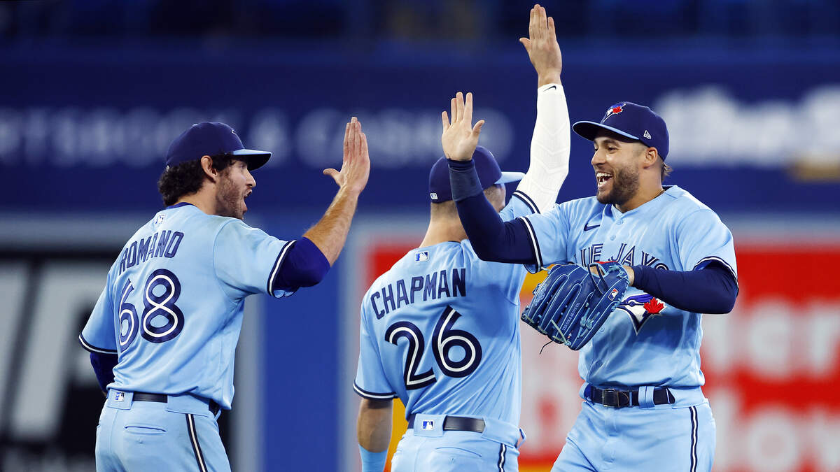 Jordan Romano #68 of the Toronto Blue Jays high fives George Springer #4 following victory in a MLB game against the Houston Astros at Rogers Centre on May 1, 2022 in Toronto, Ontario, Canada. (Photo by Vaughn Ridley/Getty Images)Photo: Getty Images