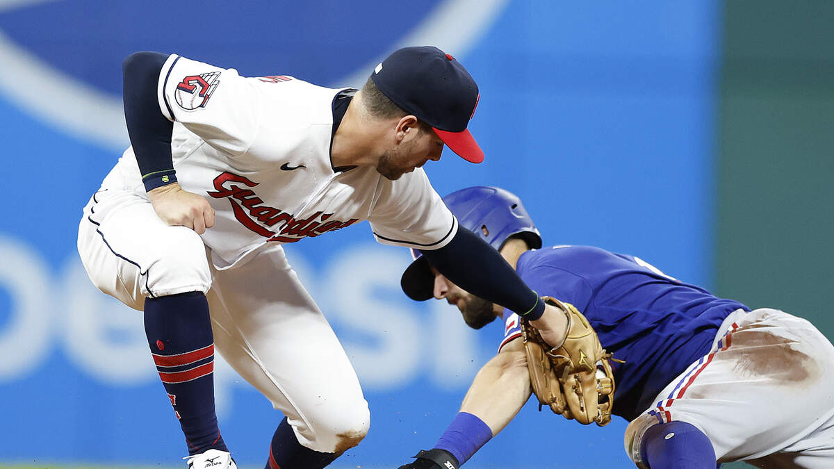 Eli White #41 of the Texas Rangers steals second base ahead of the tag of Ernie Clement #28 of the Cleveland Guardians in the sixth inning of game two of a doubleheader at Progressive Field on June 07, 2022 in Cleveland, Ohio.Photo: Getty Images