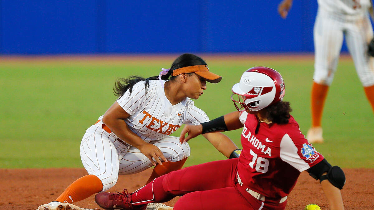 Jocelyn Alo #78 of the Oklahoma Sooners slides safely into second base on a double ahead of the throw to infielder shortstop Alyssa Washington #11 of the Texas Longhorns in the second inning during the NCAA Women's College World Series finals at the USA Softball Hall of Fame Complex on June 8, 2022 in Oklahoma City, Oklahoma. Photo: Getty Images