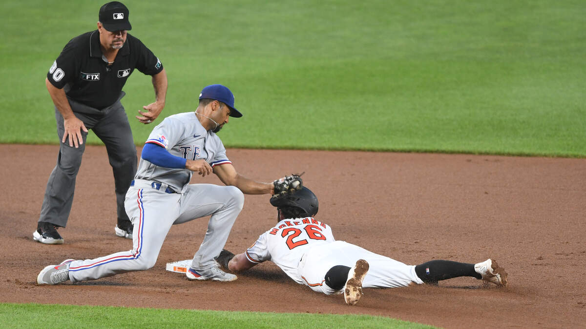 Ryan McKenna #26 of the Baltimore Orioles beats tag by Marcus Semien #2 of the Texas Rangers to steal second base in the forth inning during a baseball game at Oriole Park at Camden Yards on June 22, 2022 in Baltimore, Maryland. Photo: Getty Images