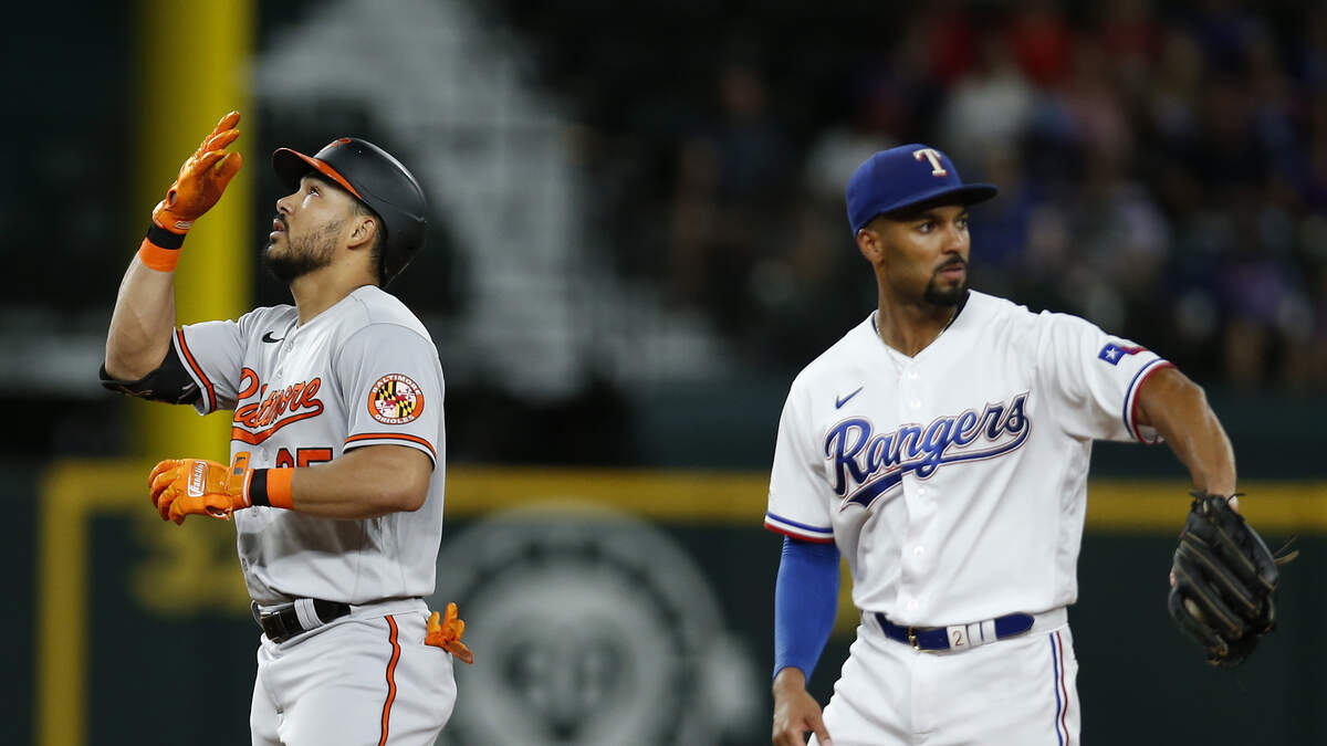 Anthony Santander #25 of the Baltimore Orioles reacts after hitting a double in the fifth inning as Marcus Semien #2 of the Texas Rangers catches the ball at Globe Life Field on August 02, 2022 in Arlington, Texas. (Photo by Tim Heitman/Getty Images)Photo: Getty Images