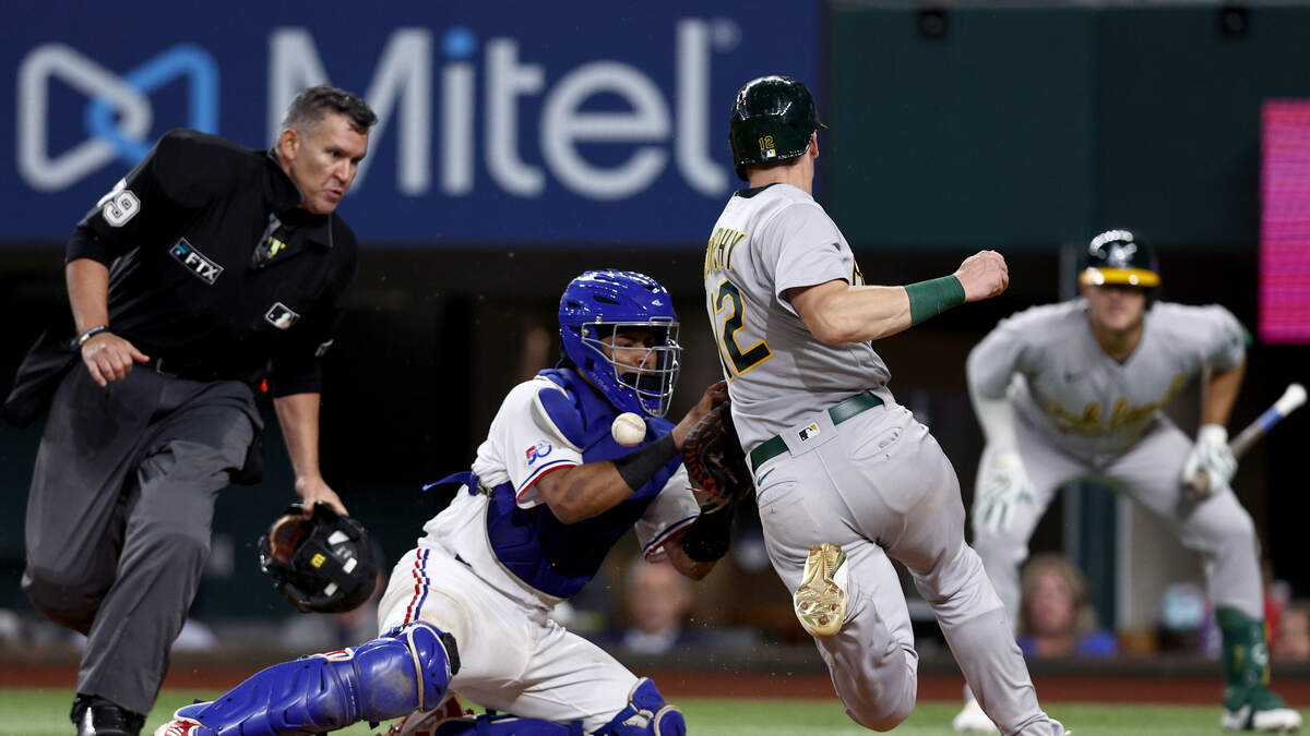 Sean Murphy #12 of the Oakland Athletics scores against Meibrys Viloria #60 of the Texas Rangers on a RBI double hit by Chad Pinder #10 of the Oakland Athletics in the top of the eighth inning at Globe Life Field.Photo: Getty Images