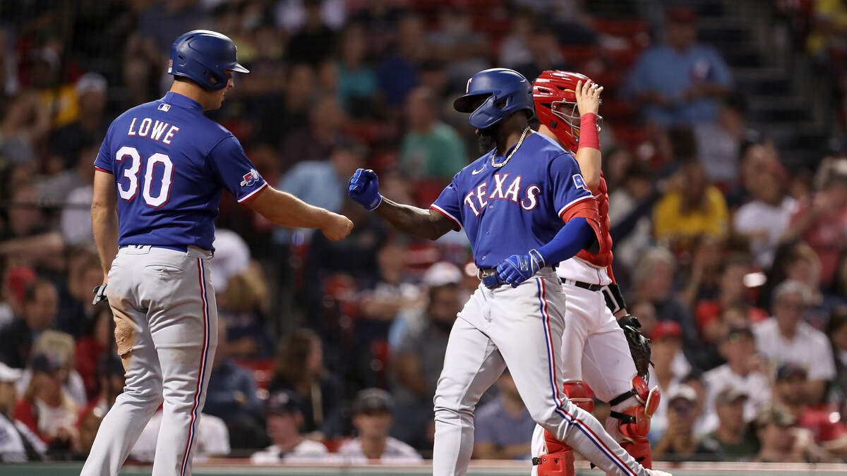 Adolis Garcia #53 of the Texas Rangers celebrates after hitting a home run during the eighth inning against the Boston Red Sox at Fenway Park on September 01, 2022 in Boston, Massachusetts. (Photo by Paul Rutherford/Getty Images)Photo: Getty Images