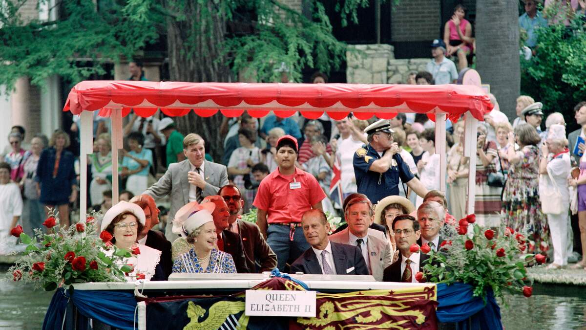 While in San Antonio, Elizabeth II and Prince Philip, Duke of Edinburgh (2nd R) rode a barge on a tour down the San Antonio River Walk on May 21, 1991.