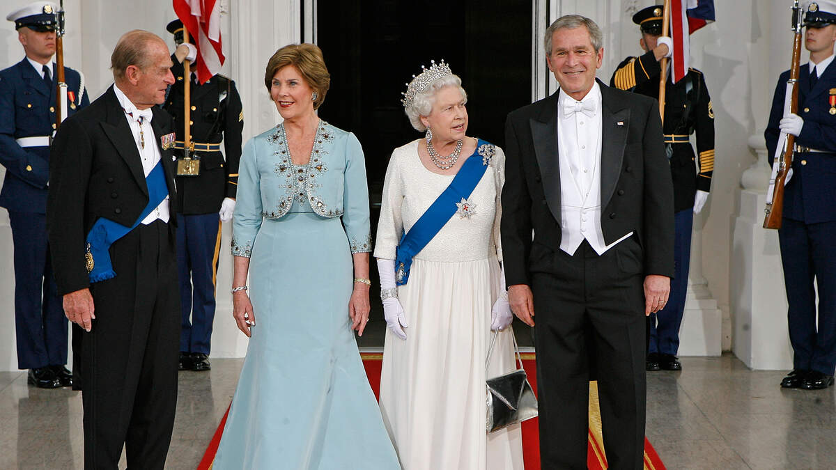 (L-R) HRH Prince Philip, the Duke of Edinburgh, First Lady Laura Bush, HM Queen Elizabeth II and U.S. President George W. Bush pose for photographs on the North Portico after arriving for a formal white-tie state dinner at the White House May 7, 2007 in Washington, DC. (Getty Images)Photo: Getty Images