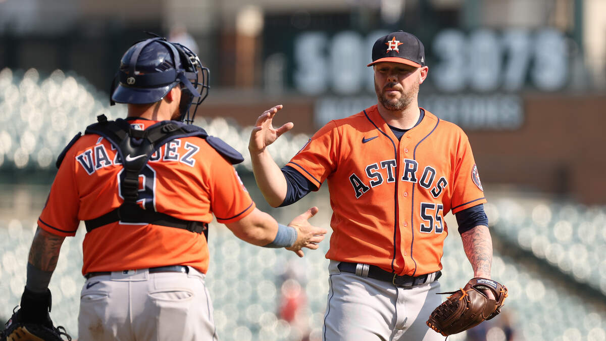 Cristian Javier #53 of the Houston Astros celebrates a 2-1 win over the Detroit Tigers with Christian Vazquez #9 of the Houston Astros at Comerica Park on September 14, 2022 in Detroit, Michigan. (Photo by Gregory Shamus/Getty Images)Photo: Getty Images