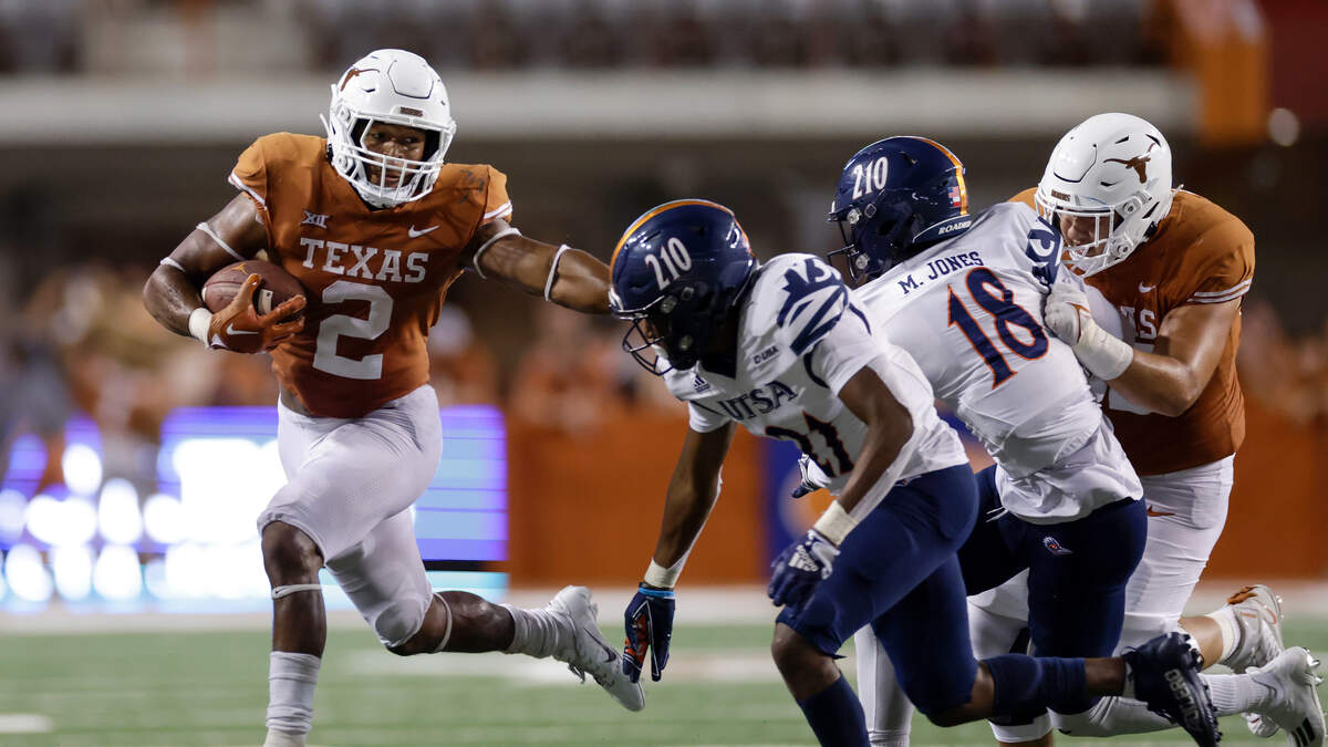 Roschon Johnson #2 of the Texas Longhorns gives a stiff arm to Ken Robinson #21 of the UTSA Roadrunners in the fourth quarter at Darrell K Royal-Texas Memorial Stadium on September 17, 2022 in Austin, Texas. (Photo by Tim Warner/Getty Images)Photo: Getty Images