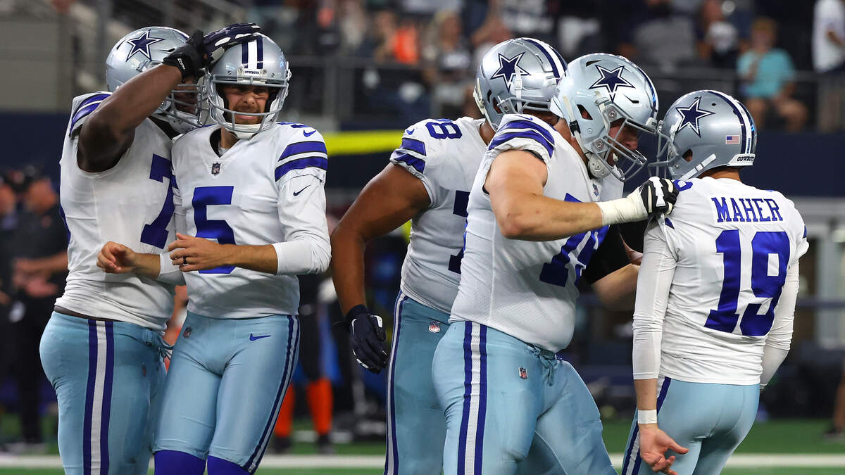 Brett Maher #19 of the Dallas Cowboys is congratulated by Matt Waletzko #79 after making a game-winning field goal against the Cincinnati Bengals during the fourth quarter at AT&T Stadium on September 18, 2022 in Arlington, Texas. (Photo by Richard Rodriguez/Getty Images)Photo: Getty Images