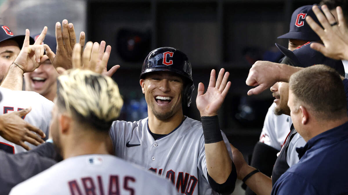 Tyler Freeman #2 of the Cleveland Guardians celebrates with teammates after scoring a run against the Texas Rangers during the third inning at Globe Life Field on September 25, 2022 in Arlington, Texas. (Photo by Ron Jenkins/Getty Images)Photo: Getty Images