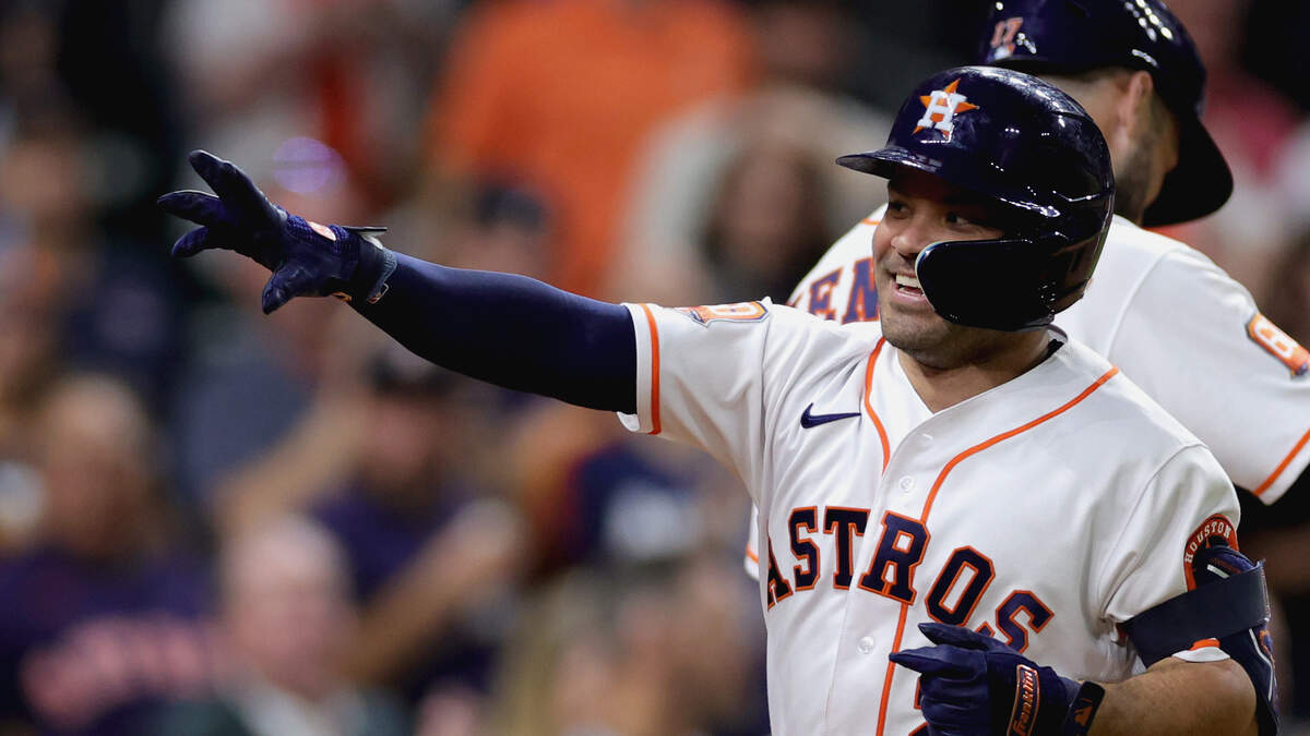 Jose Altuve #27 of the Houston Astros reacts after hitting a home run during the sixth inning against the Arizona Diamondbacks at Minute Maid Park on September 27, 2022 in Houston, Texas. (Photo by Carmen Mandato/Getty Images)Photo: Getty Images