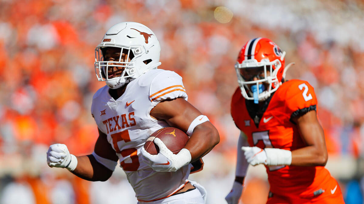 Running back Bijan Robinson #5 of the Texas Longhorns breaks free for a 42-yard touchdown with cornerback Korie Black #2 of the Oklahoma State Cowboys in pursuit in the first quarter of the game at Boone Pickens Stadium on October 22, 2022 in Stillwater, Oklahoma. (Photo by Brian Bahr/Getty Images)Photo: Getty Images