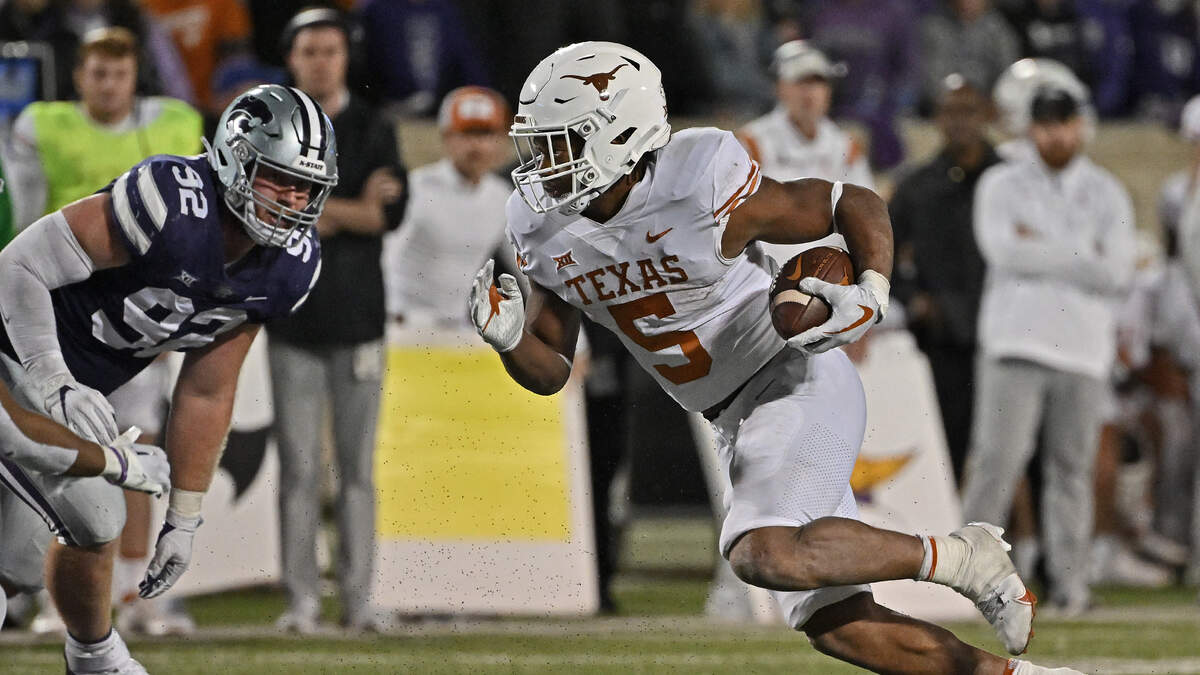 Running back Bijan Robinson #5 of the Texas Longhorns runs up field against the Kansas State Wildcats during the second half at Bill Snyder Family Football Stadium on November 05, 2022 in Manhattan, Kansas. (Photo by Peter Aiken/Getty Images)Photo: Getty Images