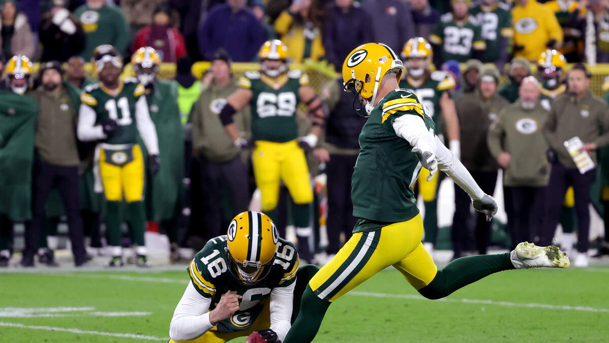 Mason Crosby #2 of the Green Bay Packers kicks a game winning field goal in overtime against the Dallas Cowboys at Lambeau Field on November 13, 2022 in Green Bay, Wisconsin. (Photo by Stacy Revere/Getty Images)Photo: Getty Images