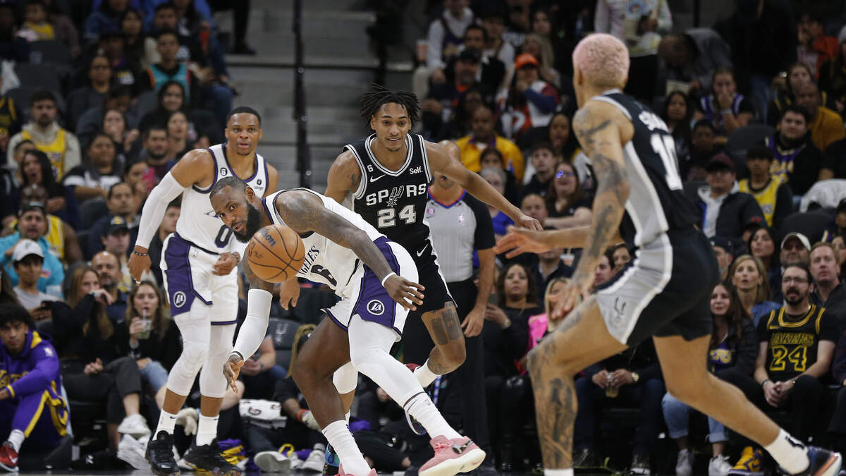 LeBron James #6 of the Los Angeles Lakers tries to steal the ball against the San Antonio Spurs in the first half at AT&T Center on November 26, 2022 in San Antonio, Texas. (Photo by Ronald Cortes/Getty Images)Photo: Getty Images