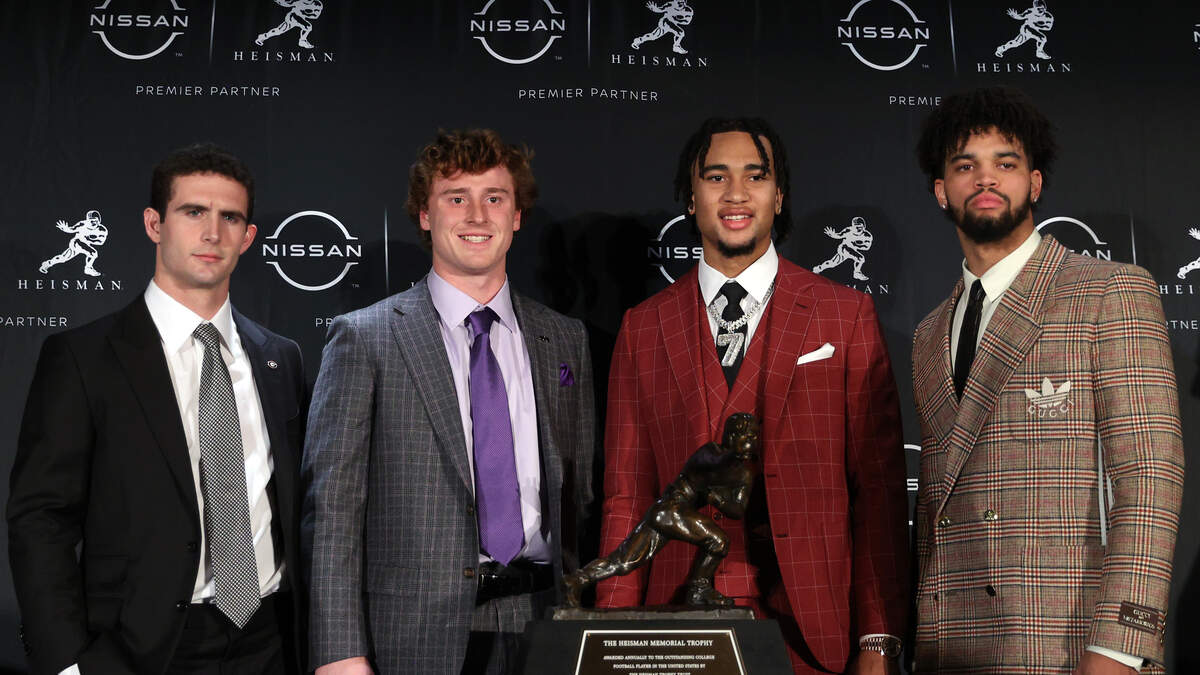 (L-R) Quarterback Stetson Bennett of the Georgia Bulldogs, Quarterback Max Duggan of the TCU Horned Frogs, Quarterback C.J. Stroud of the Ohio State Buckeyes and Quarterback Caleb Williams of the USC Trojans pose with the Heisman Trophy after a press conference prior to the 2022 Heisman Trophy Presentation at New York Marriott Marquis Hotel on December 10, 2022 in New York City. (Photo by Sarah Stier/Getty Images)Photo: Getty Images
