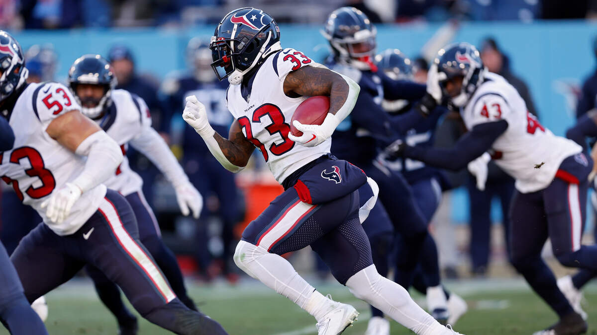 Dare Ogunbowale #33 of the Houston Texans runs the ball during the second half in the game against the Tennessee Titans at Nissan Stadium on December 24, 2022 in Nashville, Tennessee. (Photo by Wesley Hitt/Getty Images)Photo: Getty Images