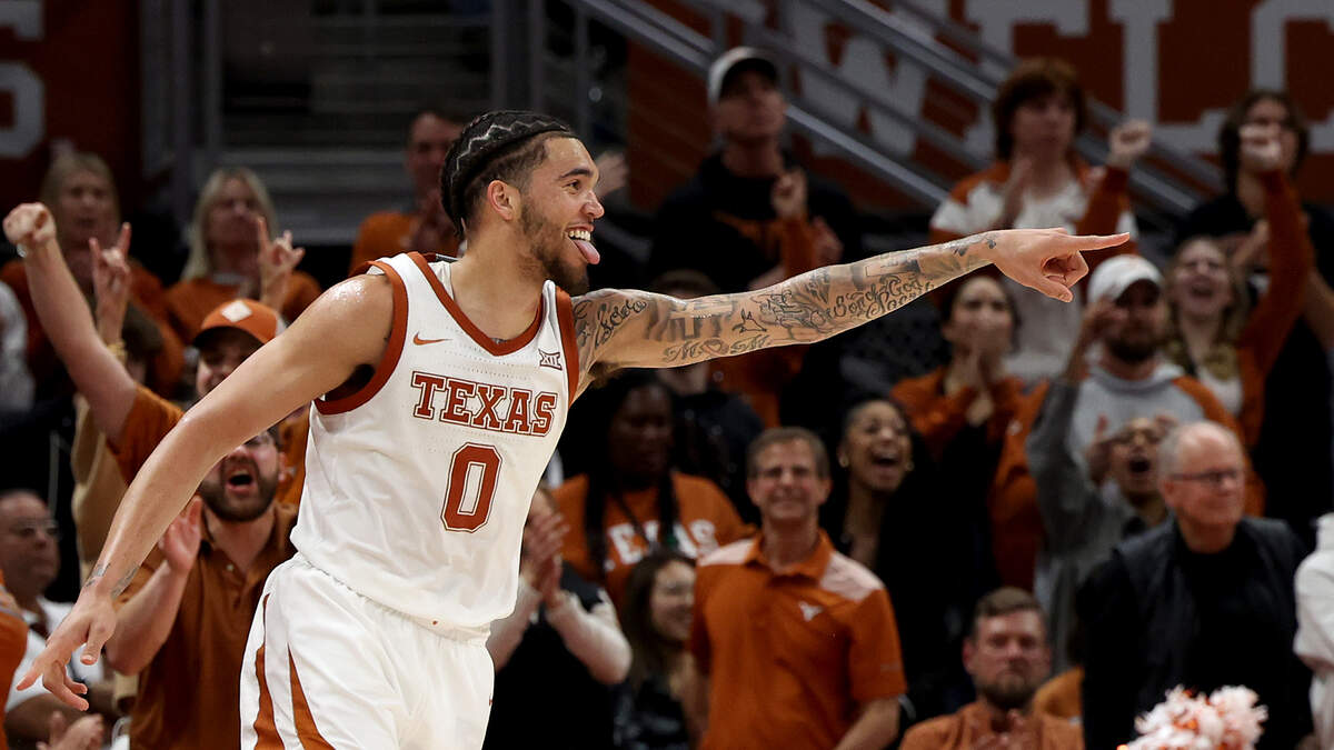 Timmy Allen #0 of the Texas Longhorns reacts after scoring a three point shot. The Texas Longhorns defeated the Texas Tech Red Raiders 72-70 at the Moody Center on January 14, 2023 in Austin, Texas. (Photo by Chris Covatta/Getty Images)Photo: Getty Images