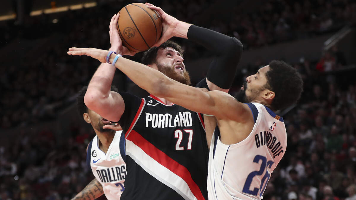 Spencer Dinwiddie #26 of the Dallas Mavericks defends Jusuf Nurkic #27 of the Portland Trail Blazers during the second quarter at Moda Center on January 15, 2023 in Portland, Oregon. (Photo by Amanda Loman/Getty Images)Photo: Getty Images