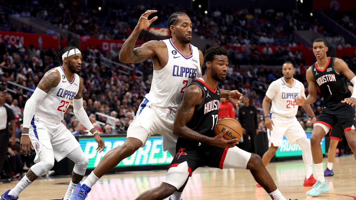 Kawhi Leonard #2 of the LA Clippers defends against the dribble by Tari Eason #17 of the Houston Rockets during the second half of a game at Crypto.com Arena on January 15, 2023 in Los Angeles, California. (Photo by Sean M. Haffey/Getty Images)Photo: Getty Images