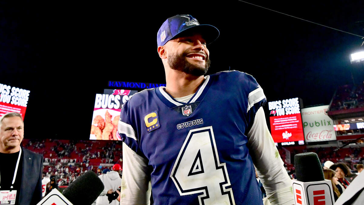 Dak Prescott #4 of the Dallas Cowboys celebrates on the field after defeating the Tampa Bay Buccaneers 31-14 in the NFC Wild Card playoff game at Raymond James Stadium on January 16, 2023 in Tampa, Florida. (Photo by Julio Aguilar/Getty Images)Photo: Getty Images