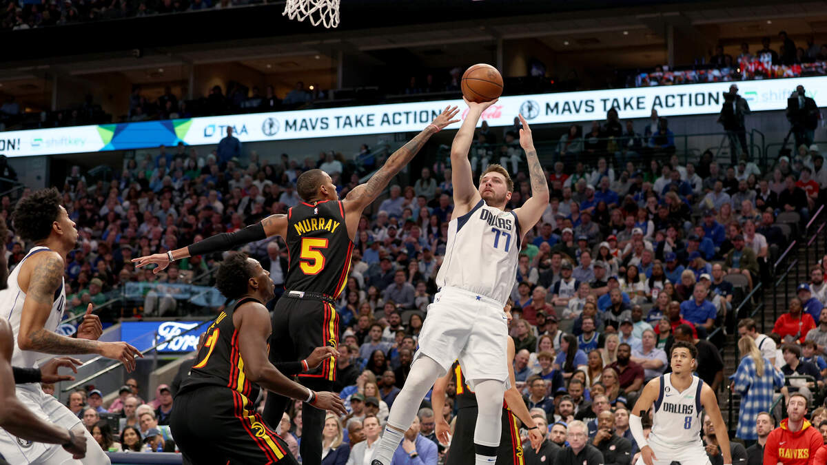 Luka Doncic #77 of the Dallas Mavericks shoots the ball against Dejounte Murray #5 of the Atlanta Hawks in the fourth quarter at American Airlines Center on January 18, 2023 in Dallas, Texas. (Photo by Tom Pennington/Getty Images)Photo: Getty Images