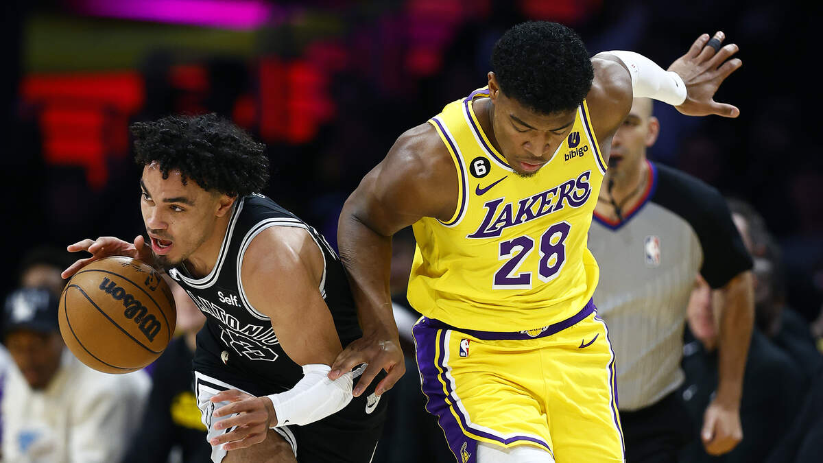 Tre Jones #33 of the San Antonio Spurs controls the ball against Rui Hachimura #28 of the Los Angeles Lakers in the first half at Crypto.com Arena on January 25, 2023 in Los Angeles, California. (Photo by Ronald Martinez/Getty Images)Photo: Getty Images