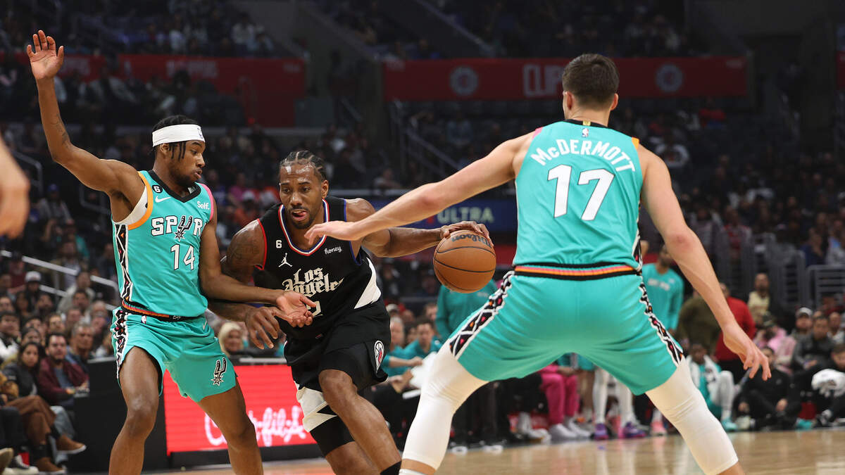 Kawhi Leonard #2 of the LA Clippers drives to the basket between Blake Wesley #14 and Doug McDermott #17 of the San Antonio Spurs during the first half at Crypto.com Arena on January 26, 2023 in Los Angeles, California. (Photo by Harry How/Getty Images) Foto: Getty Images