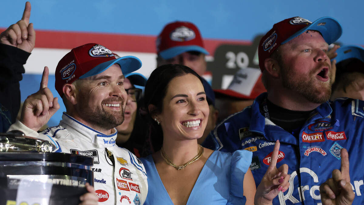 Ricky Stenhouse Jr., driver of the #47 Kroger/Cottonelle Chevrolet, and his wife Madyson Joye Stenhouse pose for photos in victory lane after winning the NASCAR Cup Series 65th Annual Daytona 500 at Daytona International Speedway on February 19, 2023 in Daytona Beach, Florida. (Photo by James Gilbert/Getty Images)Photo: Getty Images