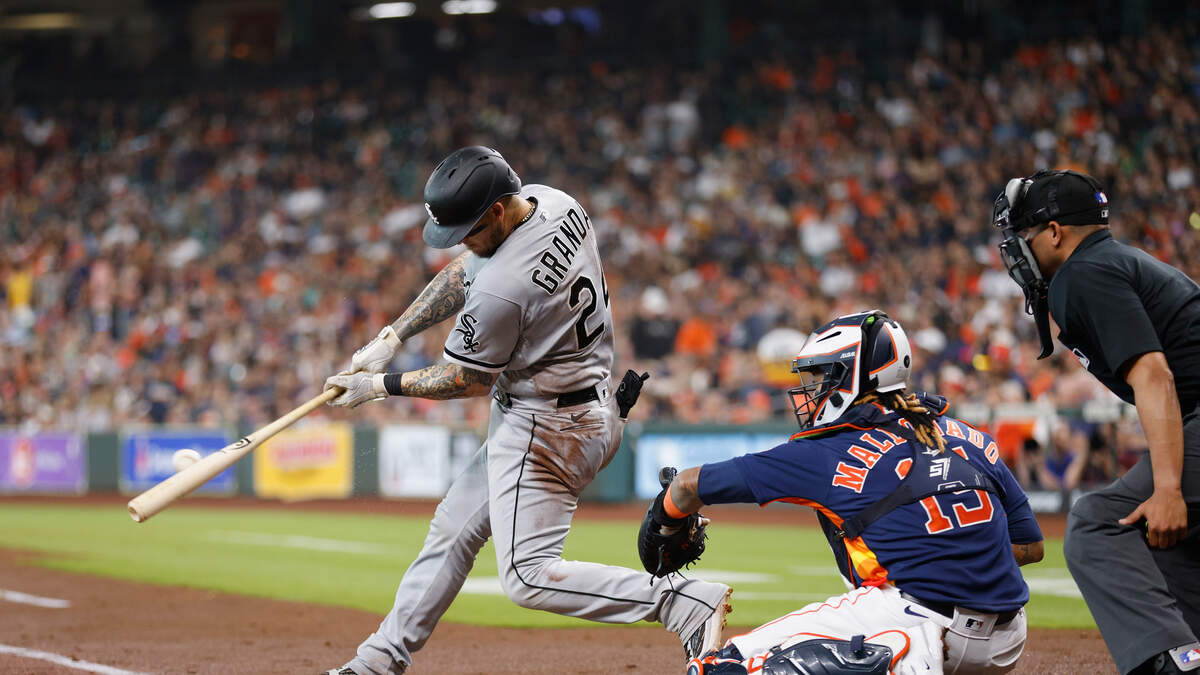 Yasmani Grandal #24 of the Chicago White Sox singles in the second inning against the Houston Astros at Minute Maid Park on April 02, 2023 in Houston, Texas. (Photo by Tim Warner/Getty Images)Photo: Getty Images