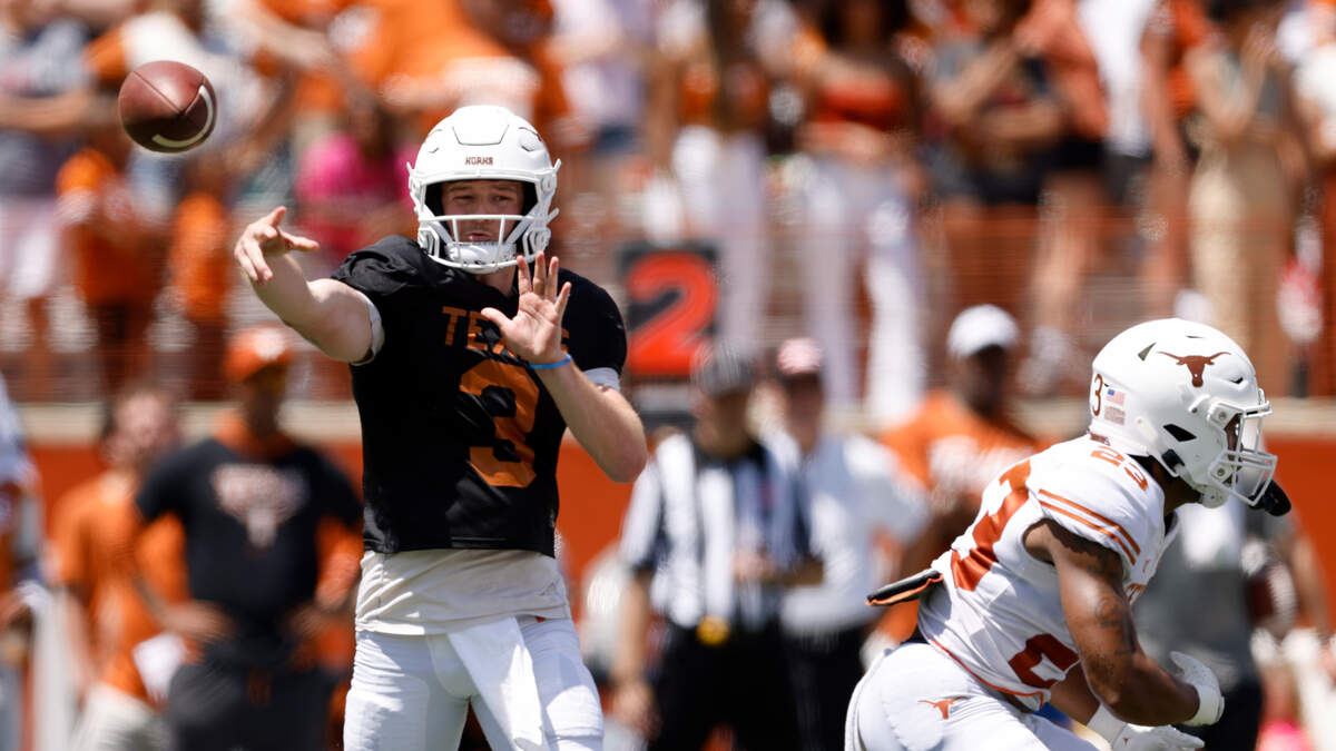 Quinn Ewers #3 of the Texas Longhorns throws a pass during the Texas Football Orange-White Spring Football Game at Darrell K Royal-Texas Memorial Stadium on April 15, 2023 in Austin, Texas. Photo: Getty Images