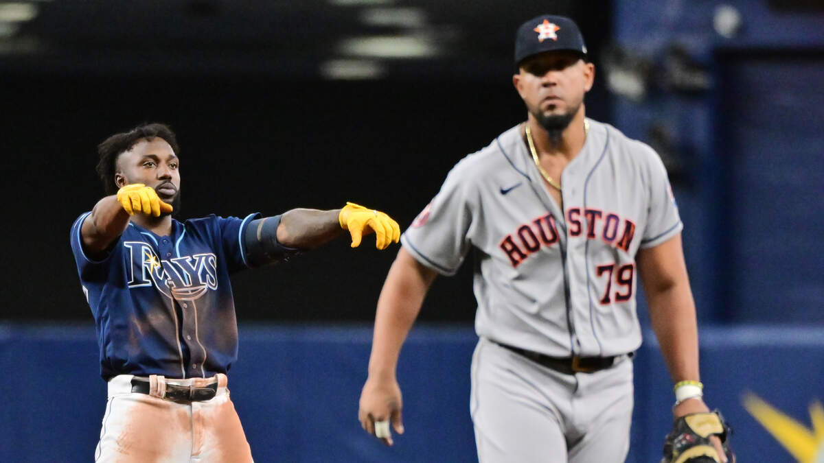 Randy Arozarena #56 of the Tampa Bay Rays reacts after hitting a double as Jose Abreu #79 of the Houston Astros returns to first base in the sixth inning at Tropicana Field on April 24, 2023 in St Petersburg, Florida. Photo: Getty Images