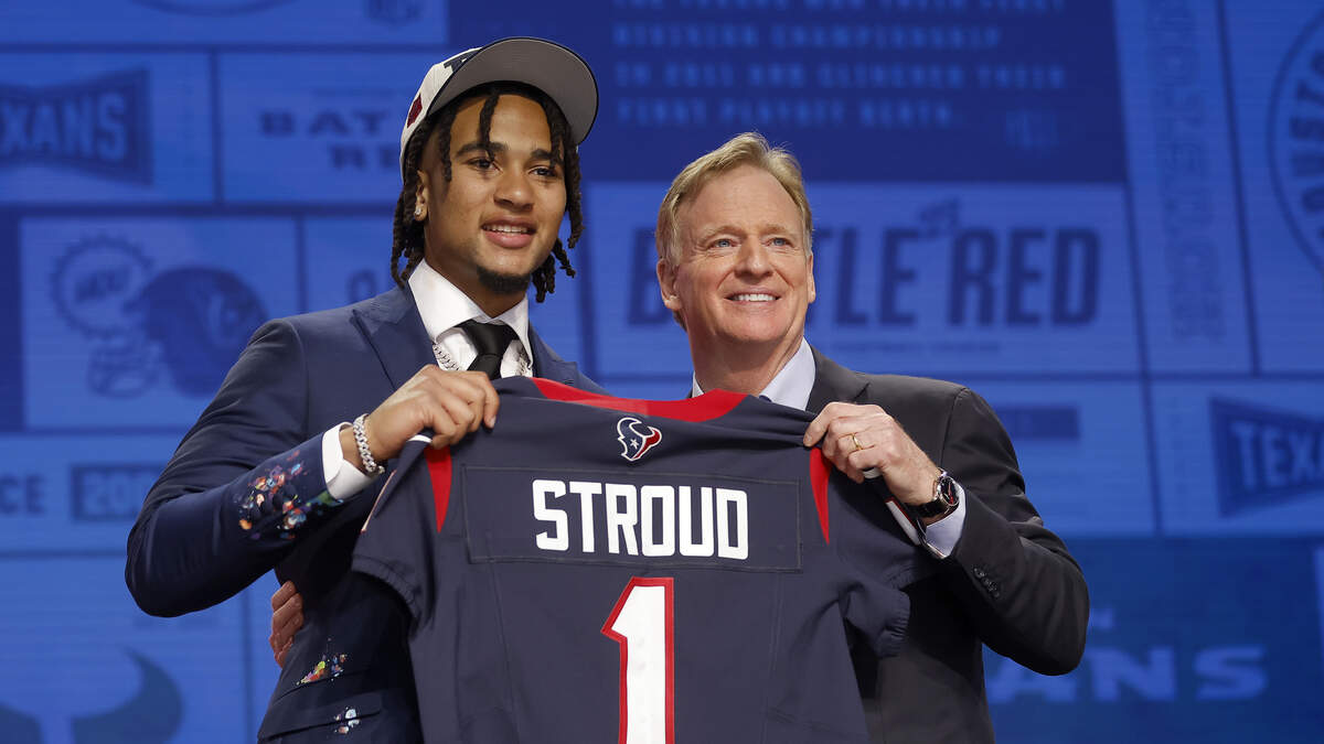 C.J. Stroud poses NFL Commissioner Roger Goodell after being selected second overall by the Houston Texans during the first round of the 2023 NFL Draft at Union Station on April 27, 2023 in Kansas City, Missouri. Photo: Getty Images