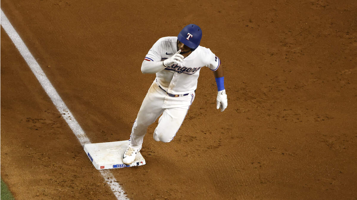 Ezequiel Duran #20 of the Texas Rangers rounds third base after hitting a two-run home run against the Arizona Diamondbacks during the sixth inning at Globe Life Field on May 2, 2023 in Arlington, Texas. (Photo by Ron Jenkins/Getty Images)Photo: Getty Images